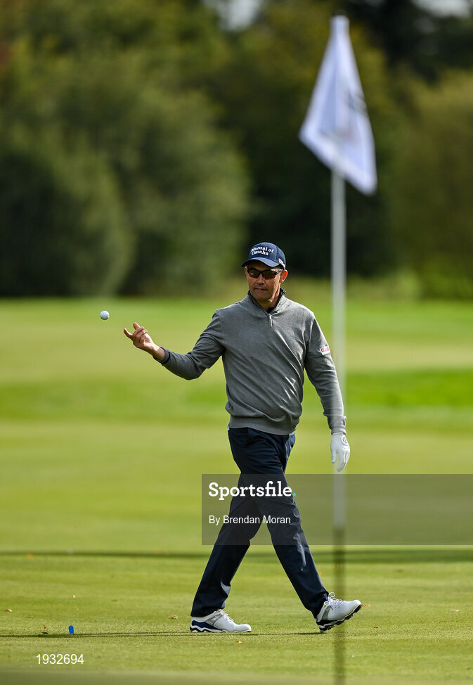 24 September 2020; Padraig Harrington of Ireland passes the ball to his caddie Ronan Flood before putting ninth green during day one of the Dubai Duty Free Irish Open Golf Championship at Galgorm Spa & Golf Resort in Ballymena, Antrim. Photo by Brendan Moran/Sportsfile