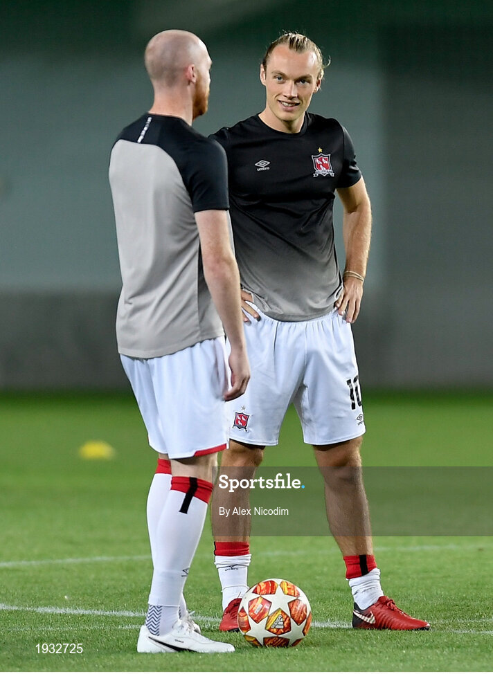 24 September 2020; Greg Sloggett, right, in conversation with Dundalk team-mate Chris Shields ahead of the UEFA Europa League Third Qualifying Round match between FC Sheriff Tiraspol and Dundalk at the Stadionul Sheriff in Tiraspol, Moldova. Photo by Alex Nicodim/Sportsfile