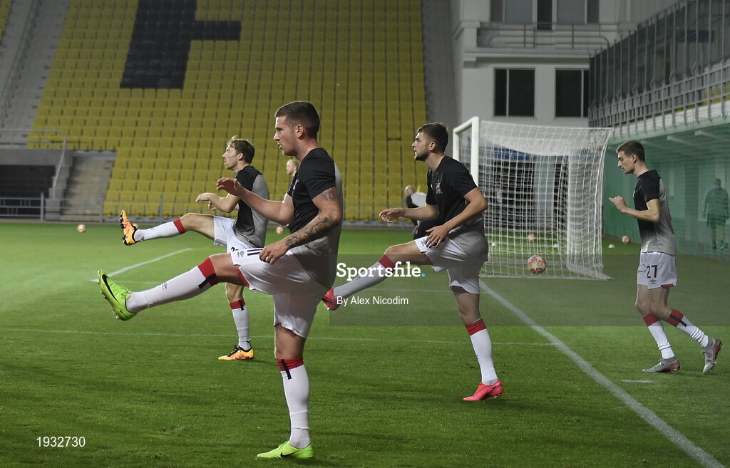 24 September 2020; Dundalk players, from left, David McMillan, Patrick McEleney, Will Patching and Daniel Kelly warm-up ahead of the UEFA Europa League Third Qualifying Round match between FC Sheriff Tiraspol and Dundalk at the Stadionul Sheriff in Tiraspol, Moldova. Photo by Alex Nicodim/Sportsfile