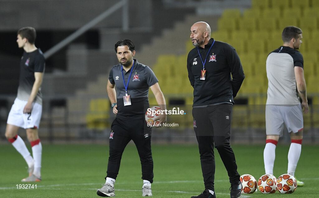24 September 2020; Dundalk assistant coach Giuseppe Rossi, left, and Dundalk interim head coach Filippo Giovagnoli prior to the UEFA Europa League Third Qualifying Round match between FC Sheriff Tiraspol and Dundalk at the Stadionul Sheriff in Tiraspol, Moldova. Photo by Alex Nicodim/Sportsfile