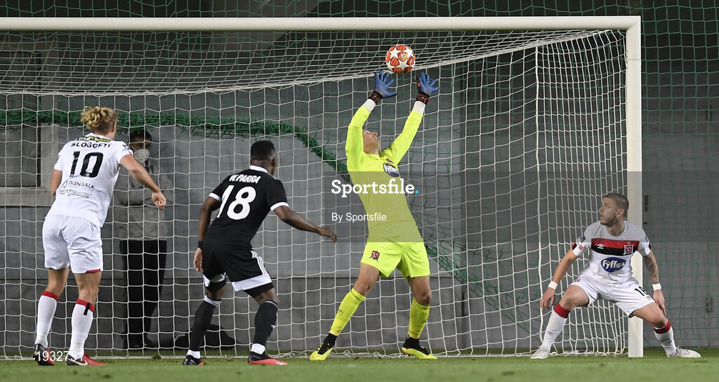 24 September 2020; Gary Rogers of Dundalk fails to save a header by Veaceslav Posmac of FC Sheriff Tiraspol to concede his side's first goal during the UEFA Europa League Third Qualifying Round match between FC Sheriff Tiraspol and Dundalk at the Stadionul Sheriff in Tiraspol, Moldova. Photo by Alex Nicodim/Sportsfile