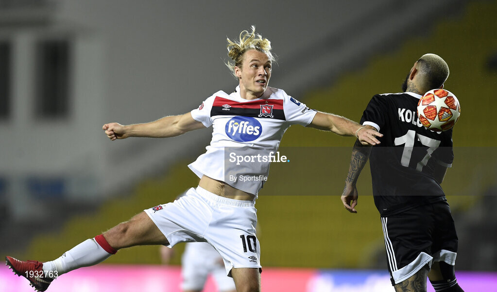 24 September 2020; Greg Sloggett of Dundalk in action against Dimitris Kolovos of FC Sheriff Tiraspol during the UEFA Europa League Third Qualifying Round match between FC Sheriff Tiraspol and Dundalk at the Stadionul Sheriff in Tiraspol, Moldova. Photo by Alex Nicodim/Sportsfile