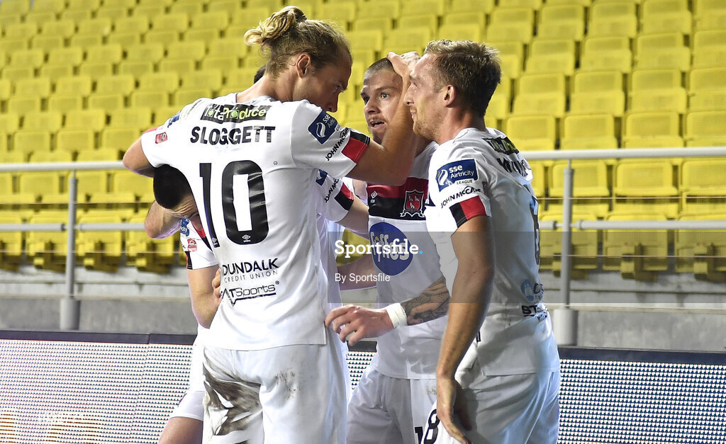 24 September 2020; Sean Murray, centre, of Dundalk celebrates with team-mates Greg Sloggett, left, and John Mountney after scoring his side's first goal during the UEFA Europa League Third Qualifying Round match between FC Sheriff Tiraspol and Dundalk at the Stadionul Sheriff in Tiraspol, Moldova. Photo by Alex Nicodim/Sportsfile