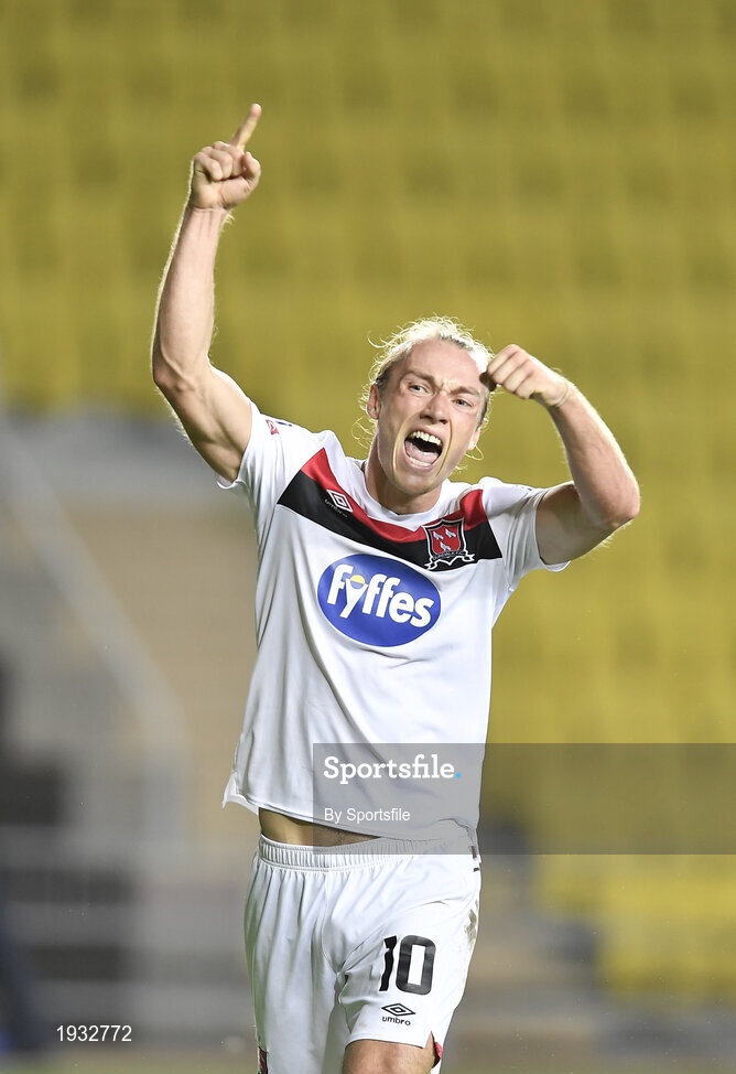 24 September 2020; Greg Sloggett of Dundalk celebrates his side's first goal, scored by Sean Murray, during the UEFA Europa League Third Qualifying Round match between FC Sheriff Tiraspol and Dundalk at the Stadionul Sheriff in Tiraspol, Moldova. Photo by Alex Nicodim/Sportsfile