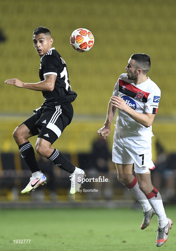 24 September 2020; Michael Duffy of Dundalk in action against Frank Castañeda of FC Sheriff Tiraspol during the UEFA Europa League Third Qualifying Round match between FC Sheriff Tiraspol and Dundalk at the Stadionul Sheriff in Tiraspol, Moldova. Photo by Alex Nicodim/Sportsfile