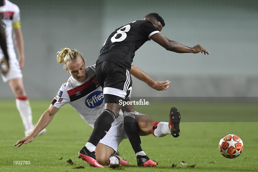 24 September 2020; Greg Sloggett of Dundalk in action against William Parra of FC Sheriff Tiraspol during the UEFA Europa League Third Qualifying Round match between FC Sheriff Tiraspol and Dundalk at the Stadionul Sheriff in Tiraspol, Moldova. Photo by Alex Nicodim/Sportsfile