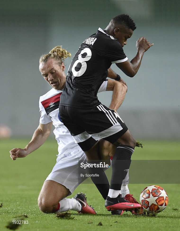 24 September 2020; Greg Sloggett of Dundalk in action against William Parra of FC Sheriff Tiraspol during the UEFA Europa League Third Qualifying Round match between FC Sheriff Tiraspol and Dundalk at the Stadionul Sheriff in Tiraspol, Moldova. Photo by Alex Nicodim/Sportsfile