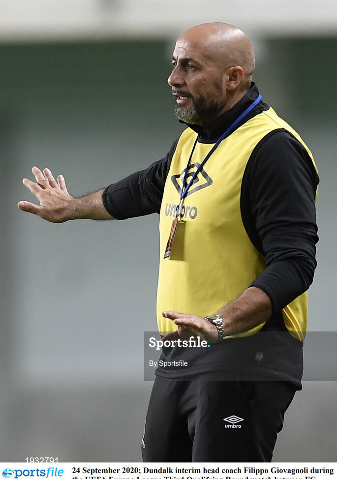 24 September 2020; Dundalk interim head coach Filippo Giovagnoli during the UEFA Europa League Third Qualifying Round match between FC Sheriff Tiraspol and Dundalk at the Stadionul Sheriff in Tiraspol, Moldova. Photo by Alex Nicodim/Sportsfile