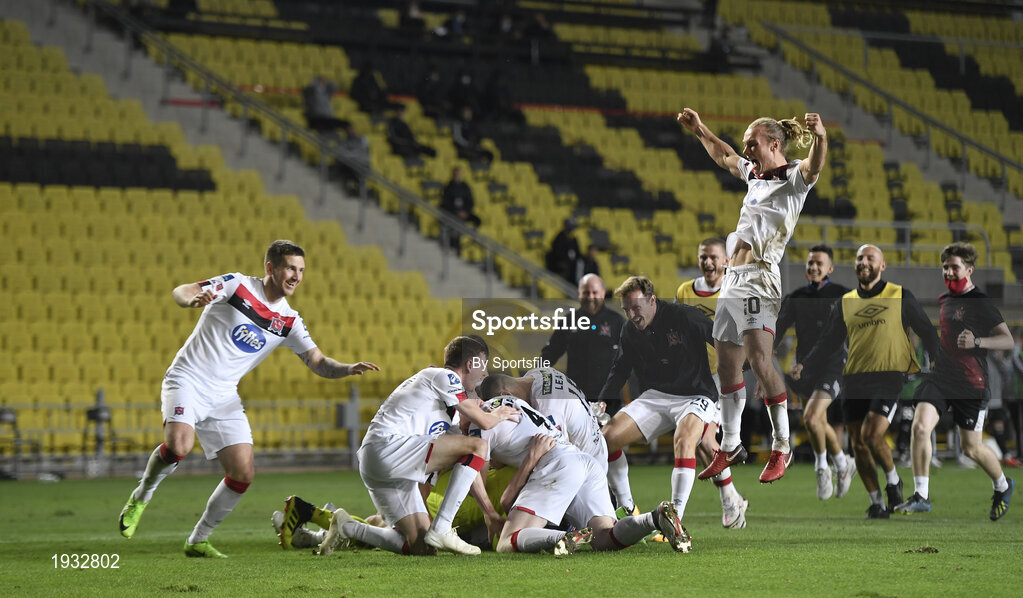 24 September 2020; Dundalk players, including Greg Sloggett, celebrate after the penalty shoot out during the UEFA Europa League Third Qualifying Round match between FC Sheriff Tiraspol and Dundalk at the Stadionul Sheriff in Tiraspol, Moldova. Photo by Alex Nicodim/Sportsfile
