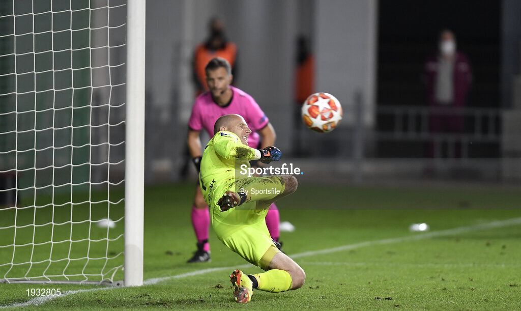 24 September 2020; Gary Rogers of Dundalk saves a penalty during the penalty shoot out during the UEFA Europa League Third Qualifying Round match between FC Sheriff Tiraspol and Dundalk at the Stadionul Sheriff in Tiraspol, Moldova. Photo by Alex Nicodim/Sportsfile