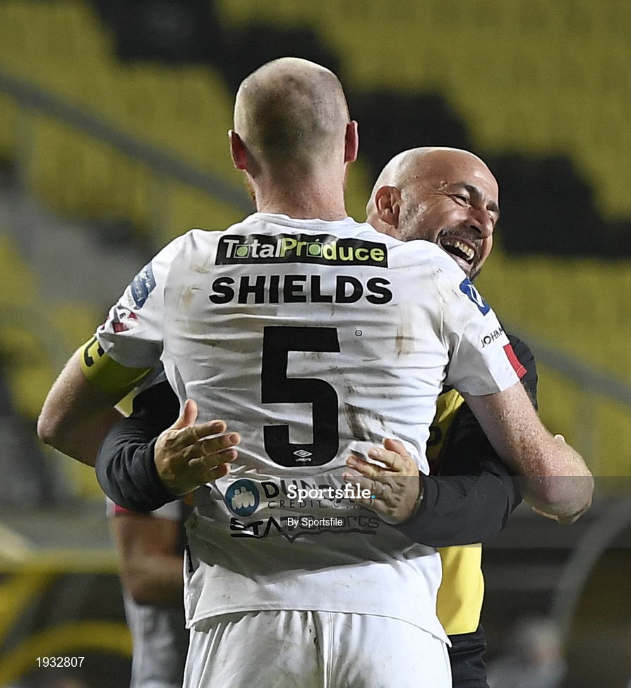 24 September 2020; Dundalk interim head coach Filippo Giovagnoli celebrates with Chris Shields following the UEFA Europa League Third Qualifying Round match between FC Sheriff Tiraspol and Dundalk at the Stadionul Sheriff in Tiraspol, Moldova. Photo by Alex Nicodim/Sportsfile