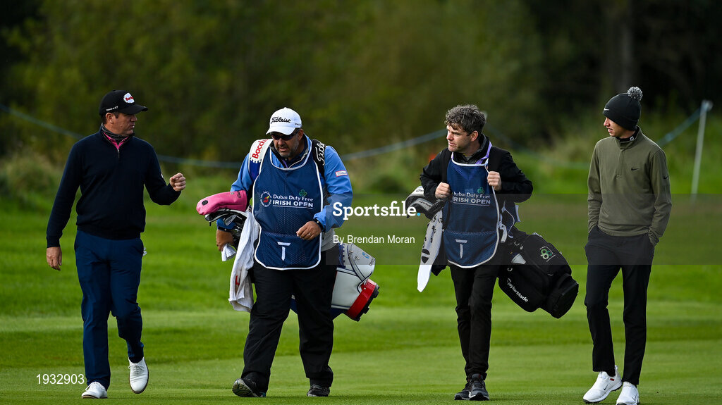 25 September 2020; Scott Hend of Australia, left, and Tom McKibben of Northern Ireland and their caddies Tony Carolan and Ryan McGuigan walk without their playing partner Sebastian Soderberg of Sweden, after The European Tour withdrew Soderberg from this week’s event after the Swede was notified of a contact who has subsequently tested positive for COVID-19, during day two of the Dubai Duty Free Irish Open Golf Championship at Galgorm Spa & Golf Resort in Ballymena, Antrim. Photo by Brendan Moran/Sportsfile