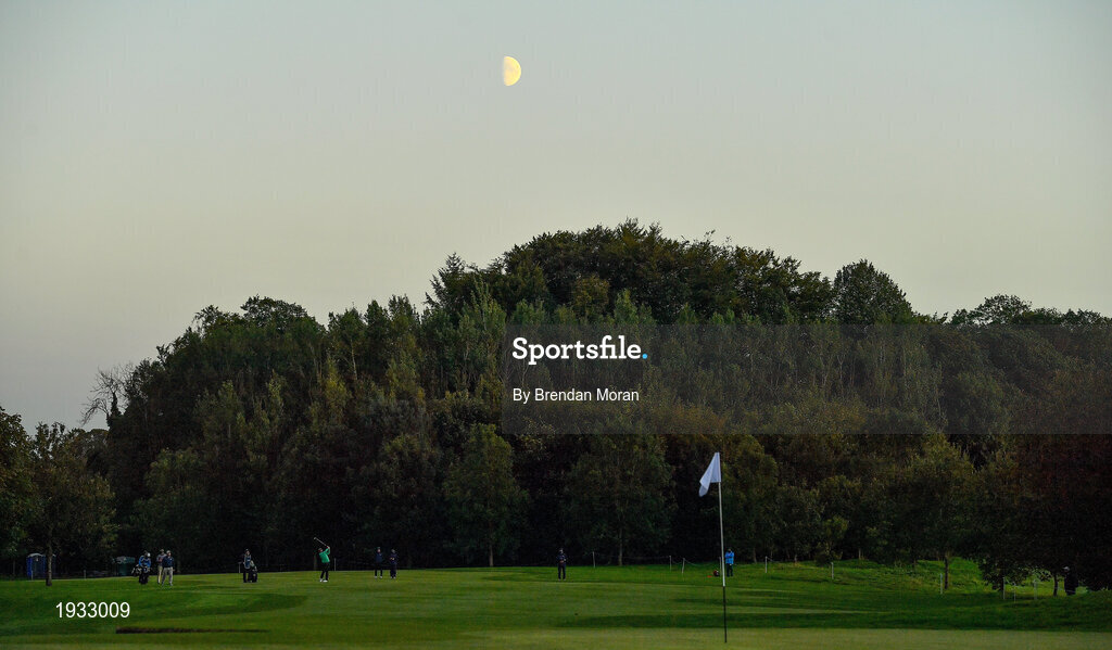 25 September 2020; Shane Lowry of Ireland watches his second shot to the 16th hole as a moon rises during day two of the Dubai Duty Free Irish Open Golf Championship at Galgorm Spa & Golf Resort in Ballymena, Antrim. Photo by Brendan Moran/Sportsfile