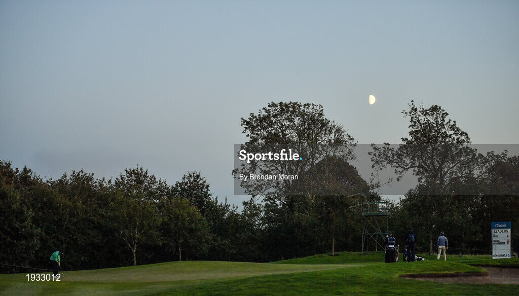 25 September 2020; Shane Lowry of Ireland putts on the 17th green as a moon rises during day two of the Dubai Duty Free Irish Open Golf Championship at Galgorm Spa & Golf Resort in Ballymena, Antrim. Photo by Brendan Moran/Sportsfile
