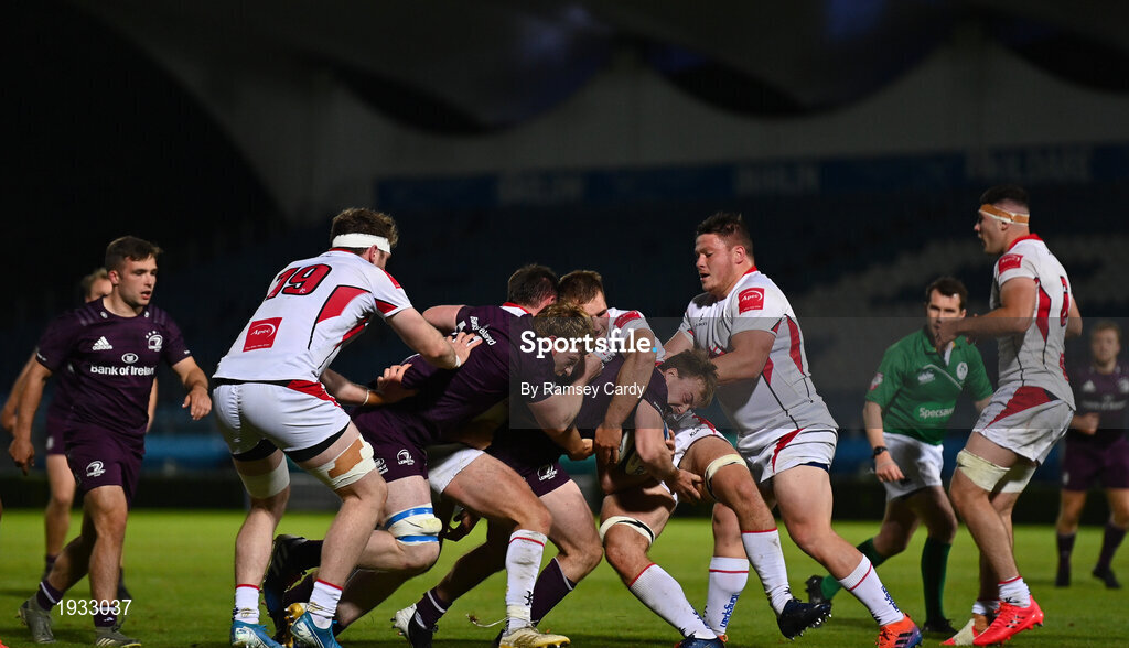 25 September 2020; David Hawkshaw of Leinster is tackled by Stewart Moore of Ulster A during the A Interprovincial Friendly match between Leinster A and Ulster A at the RDS Arena in Dublin. Photo by Ramsey Cardy/Sportsfile