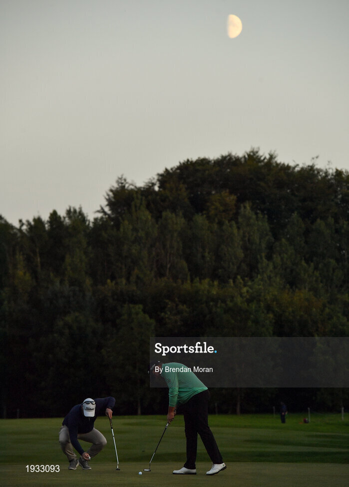 25 September 2020; Shane Lowry of Ireland putts his ball on the 16th green as George Coetzee of South Africa lines up his ball under a rising moon and fading light at the end of their second round during day two of the Dubai Duty Free Irish Open Golf Championship at Galgorm Spa & Golf Resort in Ballymena, Antrim. Photo by Brendan Moran/Sportsfile