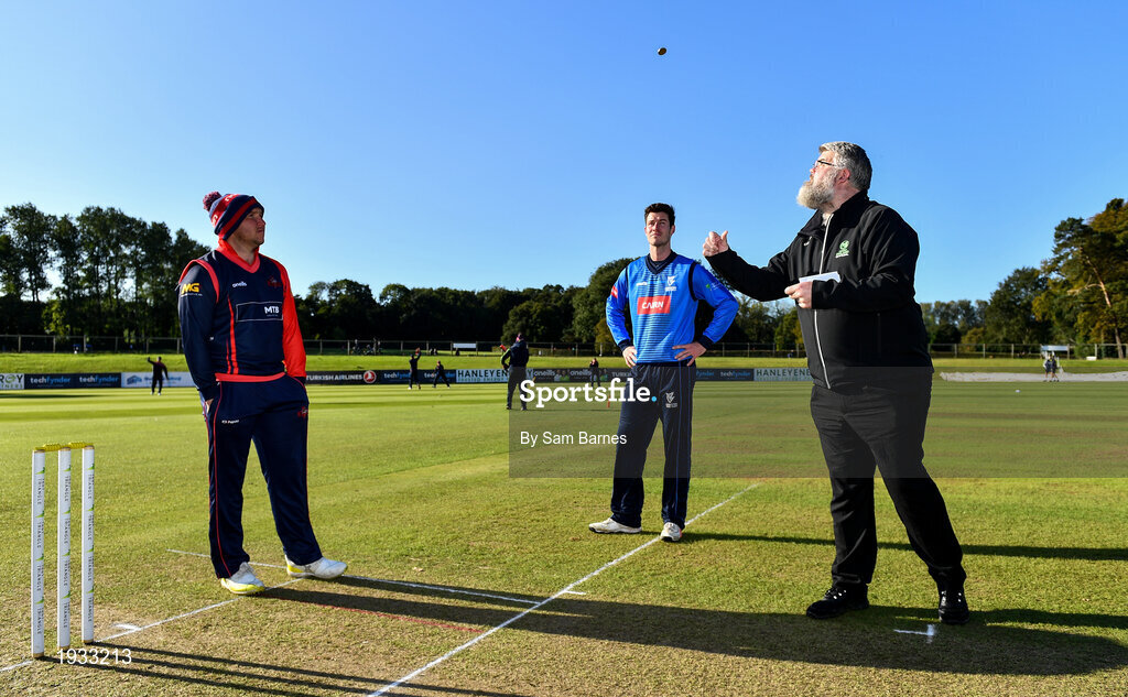 26 September 2020; Match referee Kevin Gallagher, right, makes the toss in the presence of team captains Gary Wilson of Northern Knights, left, and George Dockrell of Leinster Lightning during the Test Triangle Inter-Provincial Series 50 over match between Leinster Lightning and Northern Knights at Malahide Cricket Club in Dublin. Photo by Sam Barnes/Sportsfile