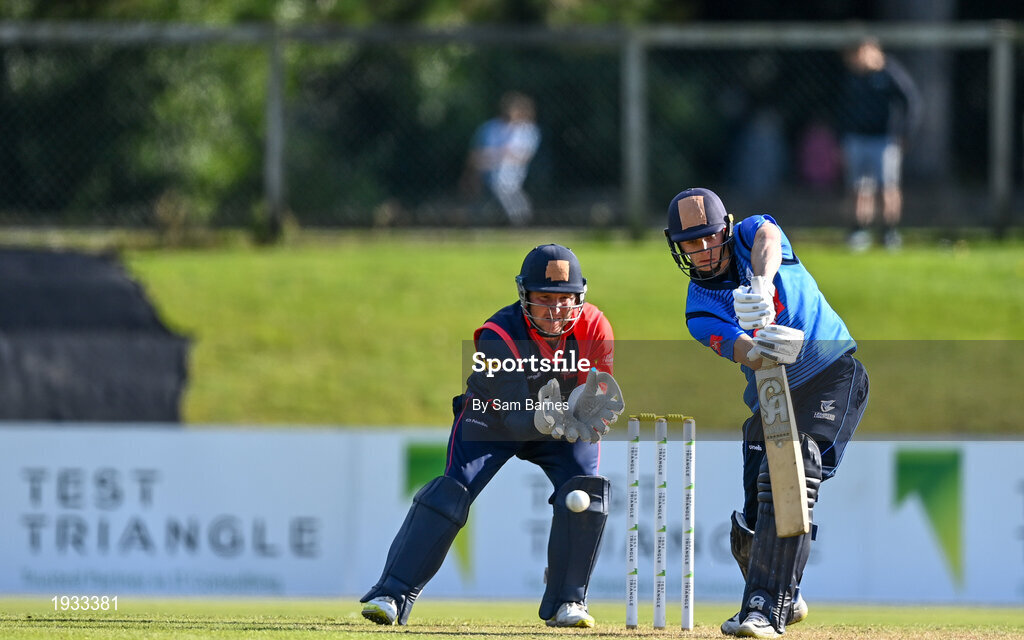 26 September 2020; Lorcan Tucker of Leinster Lightning plays a shot watched by Gary Wilson of Northern Knights during the Test Triangle Inter-Provincial Series 50 over match between Leinster Lightning and Northern Knights at Malahide Cricket Club in Dublin. Photo by Sam Barnes/Sportsfile