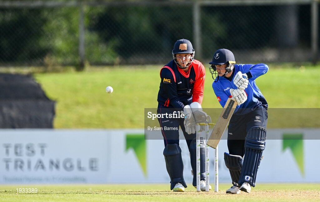 26 September 2020; Stephen Doheny of Leinster Lightning plays a shot watched by Gary Wilson of Northern Knights during the Test Triangle Inter-Provincial Series 50 over match between Leinster Lightning and Northern Knights at Malahide Cricket Club in Dublin. Photo by Sam Barnes/Sportsfile