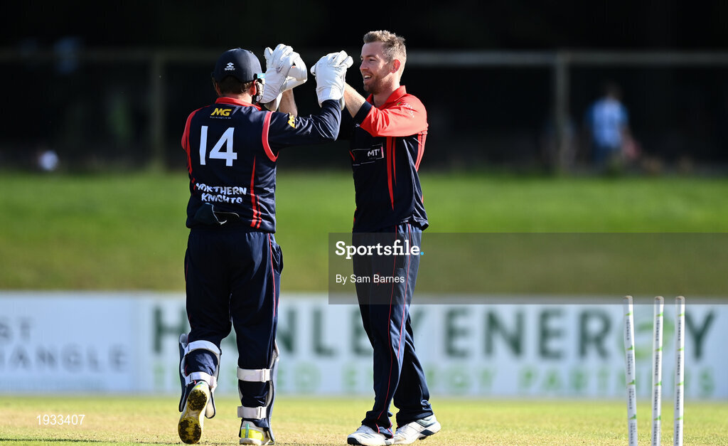 26 September 2020; Graeme McCarter of Northern Knights, right, and team-mate Gary Wilson celebrate after combining to take the wicket of Stephen Doheny of Leinster Lightning during the Test Triangle Inter-Provincial Series 50 over match between Leinster Lightning and Northern Knights at Malahide Cricket Club in Dublin. Photo by Sam Barnes/Sportsfile
