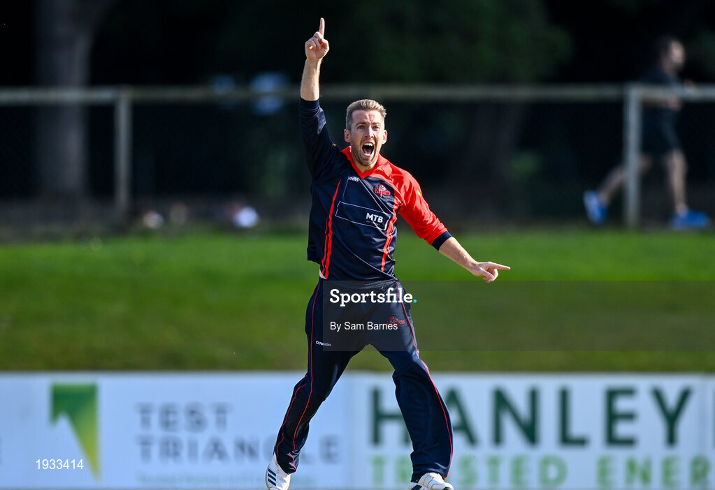 26 September 2020; Graeme McCarter of Northern Knights, left, celebrates after Stephen Doheny of Leinster Lightning is caught out by Gary Wilson off his delivery during the Test Triangle Inter-Provincial Series 50 over match between Leinster Lightning and Northern Knights at Malahide Cricket Club in Dublin. Photo by Sam Barnes/Sportsfile