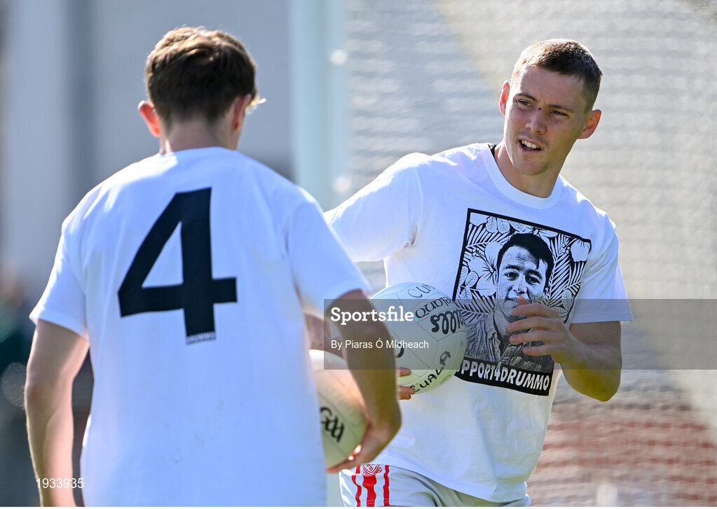 27 September 2020; Con O'Callaghan, right, and Michael Fitzsimons of Cuala wearing a t-shirt in the warm-up in support of his team-mate Seán Drummond, who was injured in an accident last year, before the Dublin County Senior 2 Football Championship Final match between Cuala and St Brigid's at Parnell Park in Dublin. Photo by Piaras Ó Mídheach/Sportsfile