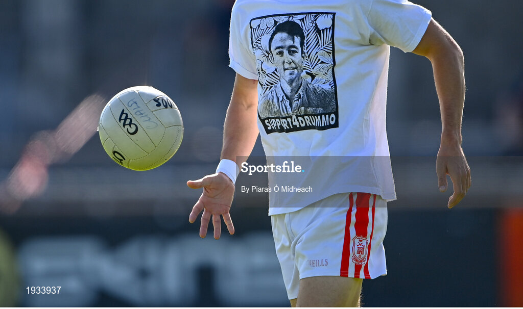 27 September 2020; A general view of a t-shirt worn by the Cuala players in the warm-up in support of their team-mate Seán Drummond, who was injured in an accident last year, before the Dublin County Senior 2 Football Championship Final match between Cuala and St Brigid's at Parnell Park in Dublin. Photo by Piaras Ó Mídheach/Sportsfile