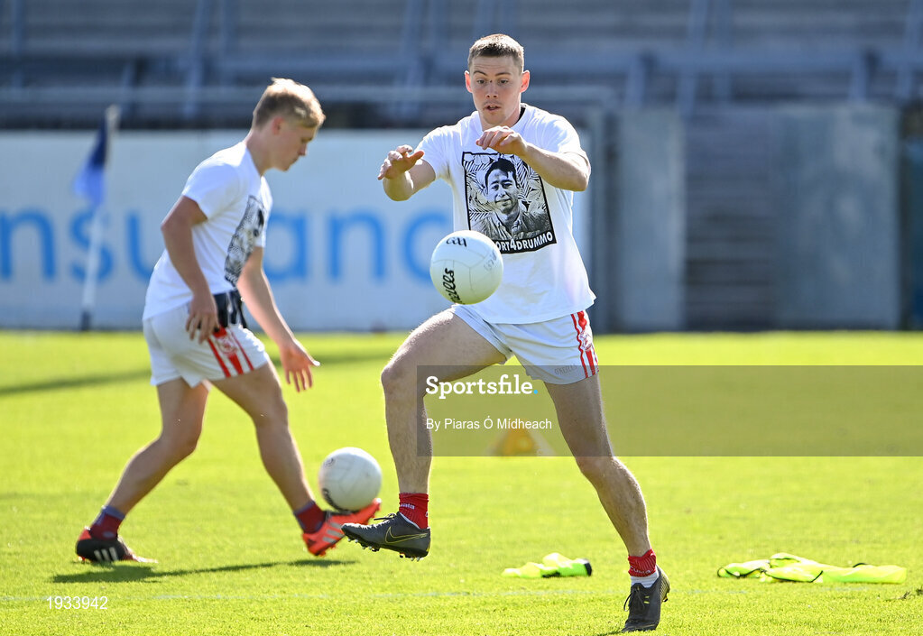 27 September 2020; Con O'Callaghan of Cuala wearing a t-shirt in the warm-up in support of his team-mate Seán Drummond, who was injured in an accident last year, before the Dublin County Senior 2 Football Championship Final match between Cuala and St Brigid's at Parnell Park in Dublin. Photo by Piaras Ó Mídheach/Sportsfile