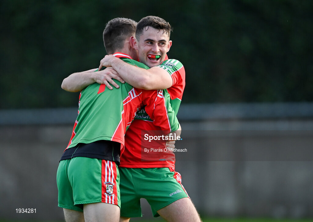 27 September 2020; Ballymun Kickhams players Evan Comerford and Darragh Conlon, right, celebrate after the Dublin County Senior 1 Football Championship Final match between Ballyboden St Enda's and Ballymun Kickhams at Parnell Park in Dublin. Photo by Piaras Ó Mídheach/Sportsfile