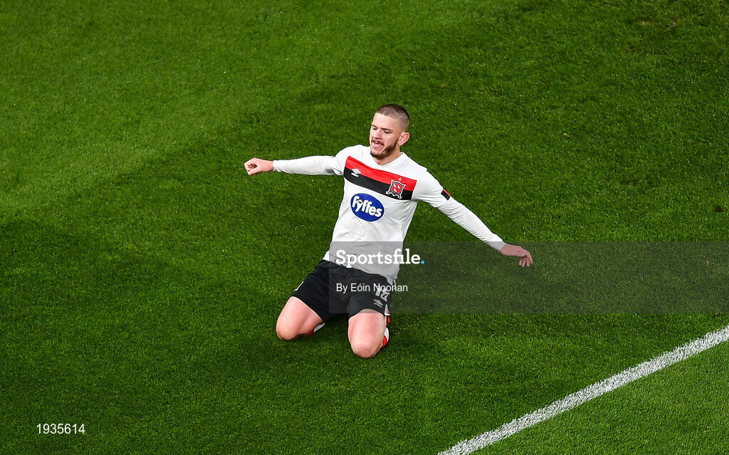 1 October 2020; Sean Murray of Dundalk celebrates after scoring his side's first goal during the UEFA Europa League Play-off match between Dundalk and Ki Klaksvik at the Aviva Stadium in Dublin. Photo by Eóin Noonan/Sportsfile