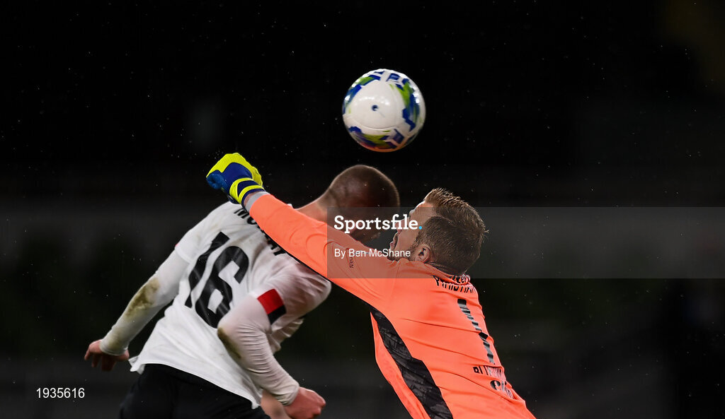 1 October 2020; Sean Murray of Dundalk heads his side's first goal ahead of Kristian Joensen of Ki Klaksvik during the UEFA Europa League Play-off match between Dundalk and Ki Klaksvik at the Aviva Stadium in Dublin. Photo by Ben McShane/Sportsfile
