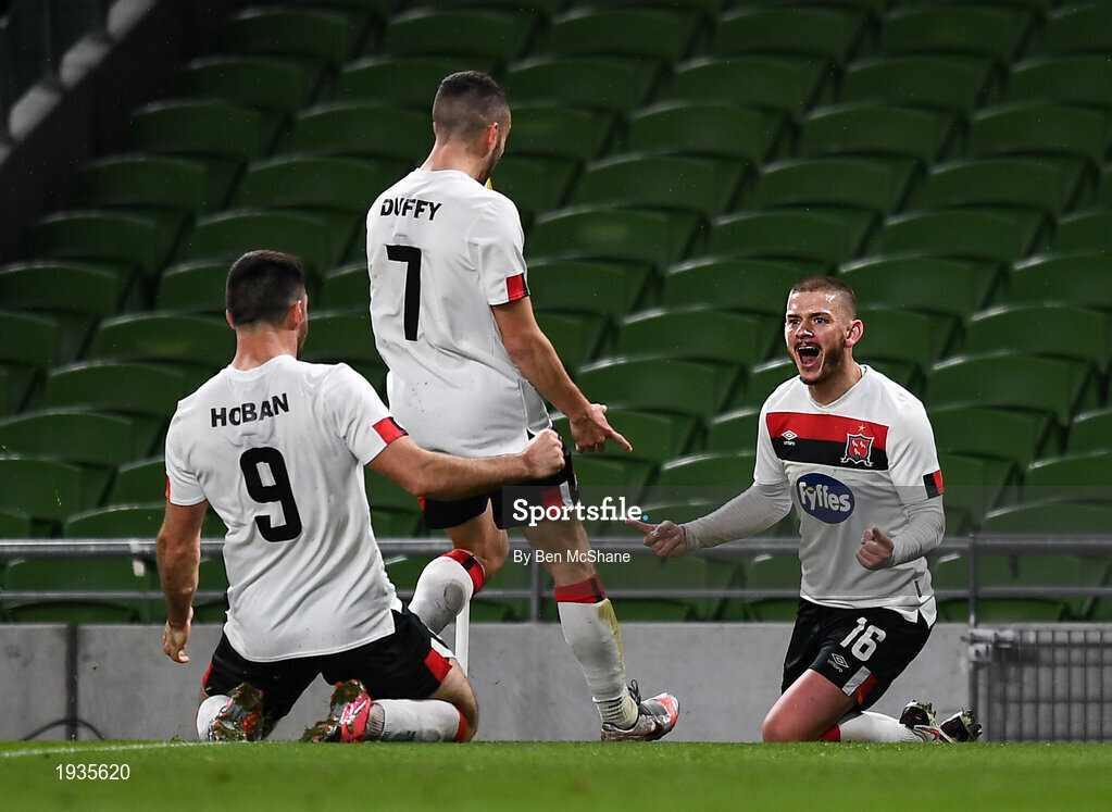 1 October 2020; Michael Duffy of Dundalk, centre, celebrates with team-mates Sean Murray, right, and Patrick Hoban after scoring their side's first goal during the UEFA Europa League Play-off match between Dundalk and Ki Klaksvik at the Aviva Stadium in Dublin. Photo by Ben McShane/Sportsfile