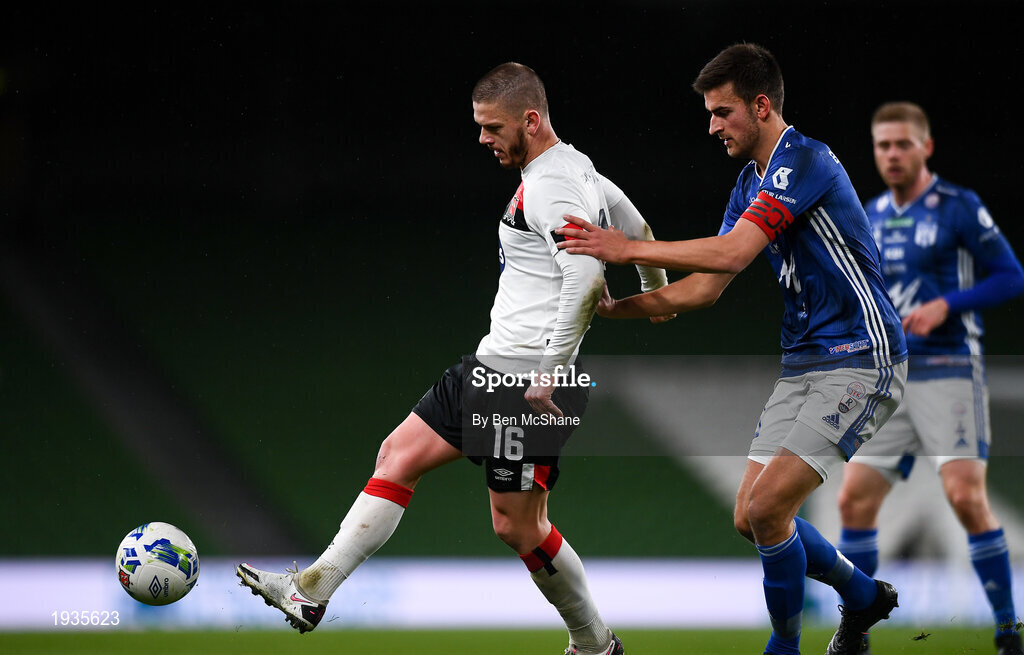 1 October 2020; Sean Murray of Dundalk in action against Jákup Andreasen of Ki Klaksvik during the UEFA Europa League Play-off match between Dundalk and Ki Klaksvik at the Aviva Stadium in Dublin. Photo by Ben McShane/Sportsfile