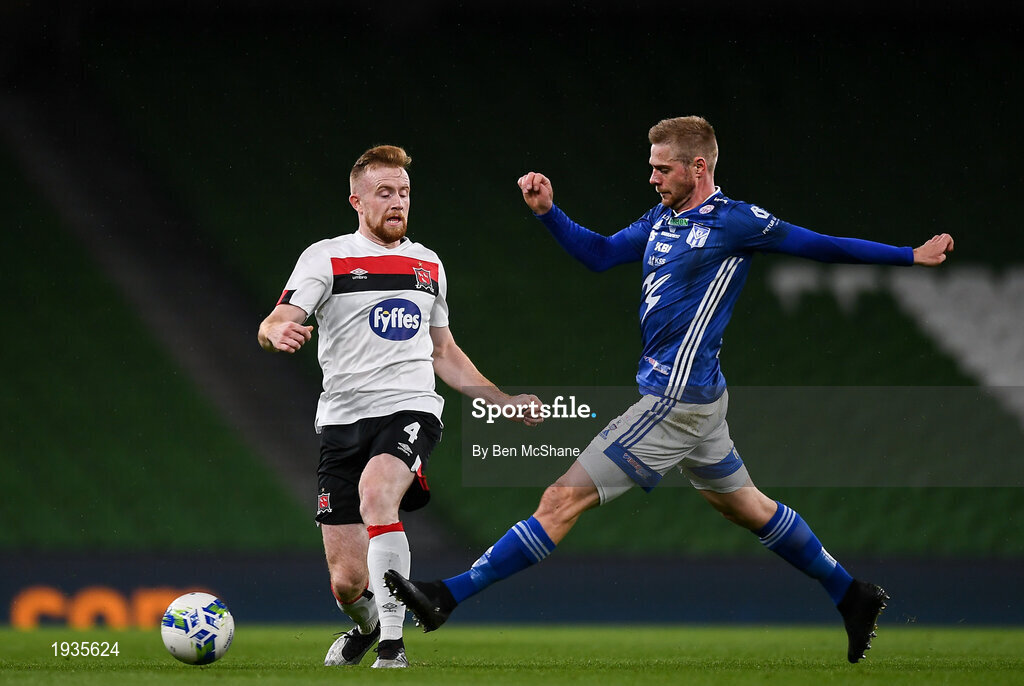 1 October 2020; Sean Hoare of Dundalk in action against Páll Klettskard of Ki Klaksvik during the UEFA Europa League Play-off match between Dundalk and Ki Klaksvik at the Aviva Stadium in Dublin. Photo by Ben McShane/Sportsfile