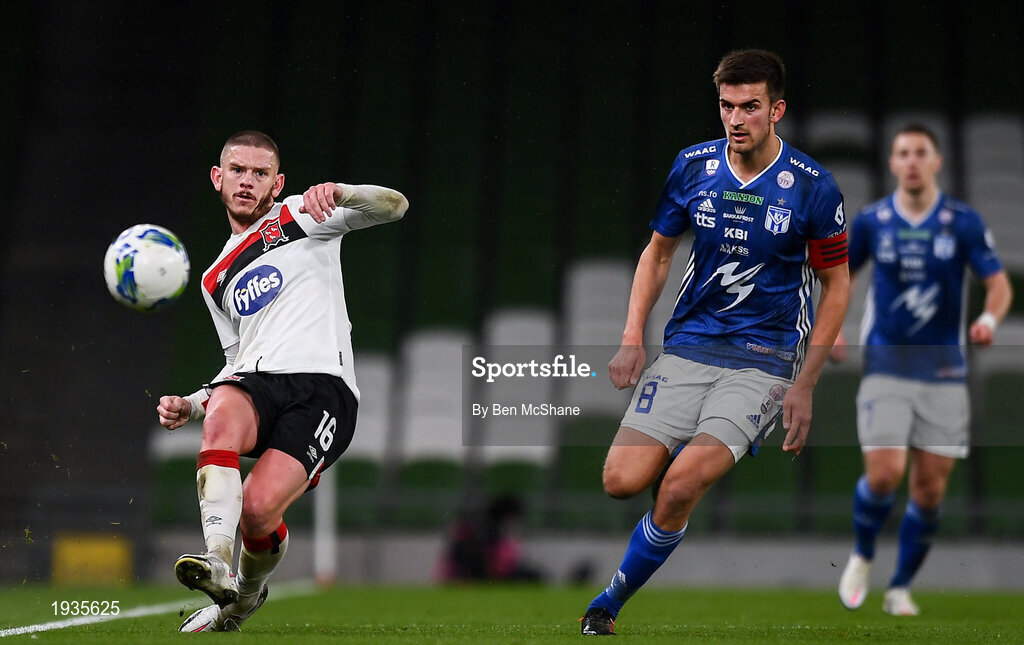 1 October 2020; Sean Murray of Dundalk in action against Jákup Andreasen of Ki Klaksvik during the UEFA Europa League Play-off match between Dundalk and Ki Klaksvik at the Aviva Stadium in Dublin. Photo by Ben McShane/Sportsfile