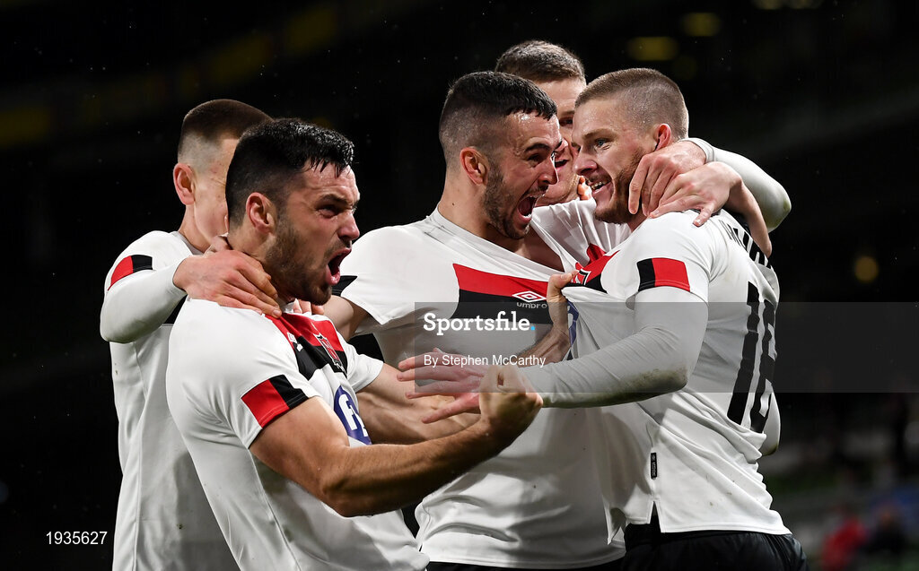 1 October 2020; Sean Murray, right, of Dundalk celebrates with team-mates, from left, Darragh Leahy, Patrick Hoban, Michael Duffy and Patrick McEleney after scoring his side's first goal during the UEFA Europa League Play-off match between Dundalk and Ki Klaksvik at the Aviva Stadium in Dublin. Photo by Stephen McCarthy/Sportsfile