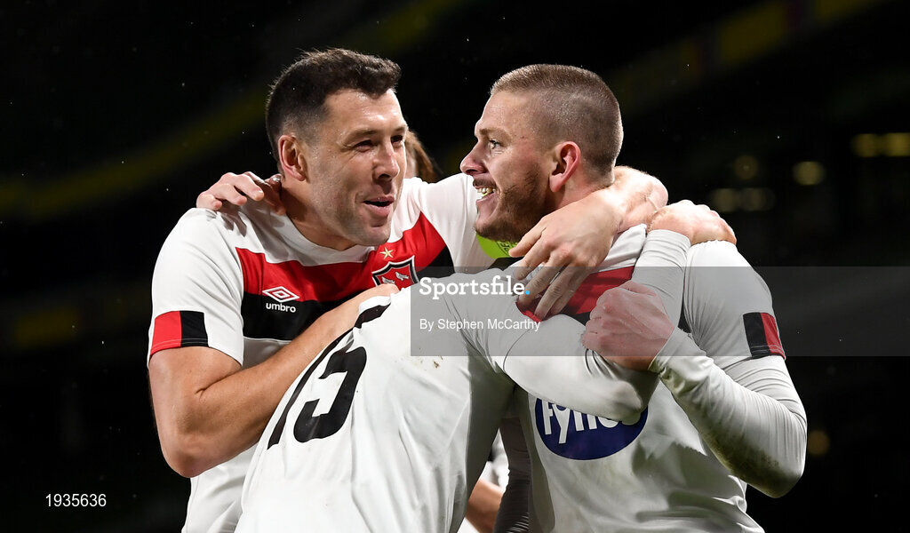 1 October 2020; Sean Murray of Dundalk celebrates with team-mates including Brian Gartland, left, after scoring his side's first goal during the UEFA Europa League Play-off match between Dundalk and Ki Klaksvik at the Aviva Stadium in Dublin. Photo by Stephen McCarthy/Sportsfile