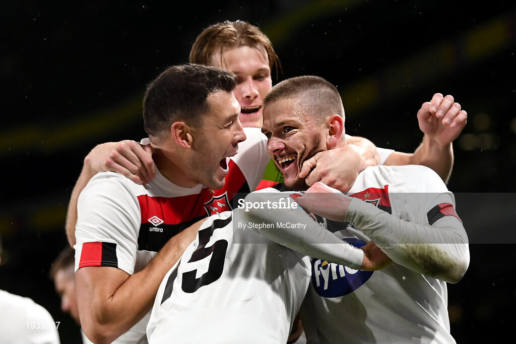 1 October 2020; Sean Murray of Dundalk celebrates with team-mates including Brian Gartland, left, after scoring his side's first goal during the UEFA Europa League Play-off match between Dundalk and Ki Klaksvik at the Aviva Stadium in Dublin. Photo by Stephen McCarthy/Sportsfile
