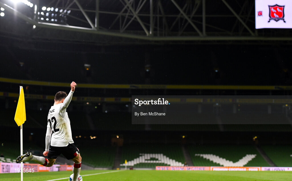 1 October 2020; Stefan Colovic of Dundalk takes a corner kick during the UEFA Europa League Play-off match between Dundalk and Ki Klaksvik at the Aviva Stadium in Dublin. Photo by Ben McShane/Sportsfile
