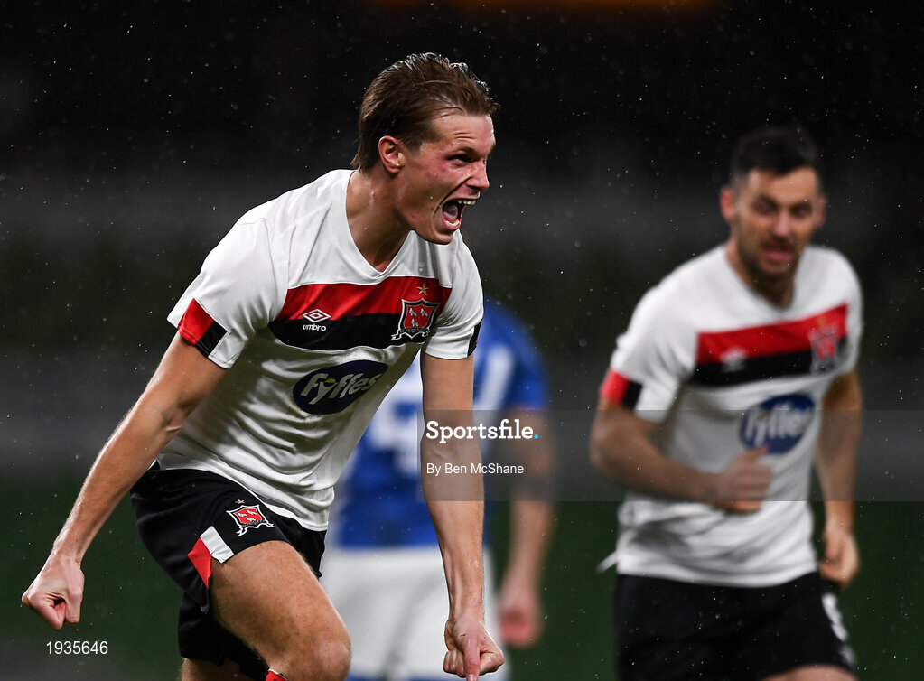 1 October 2020; Daniel Cleary of Dundalk celebrates scoring his side's second goal during the UEFA Europa League Play-off match between Dundalk and Ki Klaksvik at the Aviva Stadium in Dublin. Photo by Ben McShane/Sportsfile
