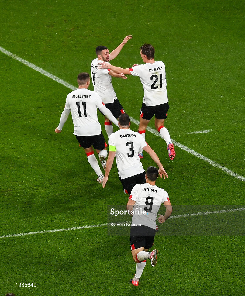 1 October 2020; Daniel Cleary of Dundalk, 21, celebrates with team-mates after scoring his side's second goal during the UEFA Europa League Play-off match between Dundalk and Ki Klaksvik at the Aviva Stadium in Dublin. Photo by Eóin Noonan/Sportsfile