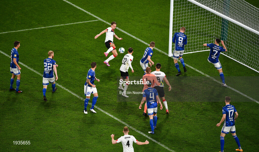 1 October 2020; Daniel Cleary of Dundalk shoots to score his side's second goal during the UEFA Europa League Play-off match between Dundalk and Ki Klaksvik at the Aviva Stadium in Dublin. Photo by Eóin Noonan/Sportsfile