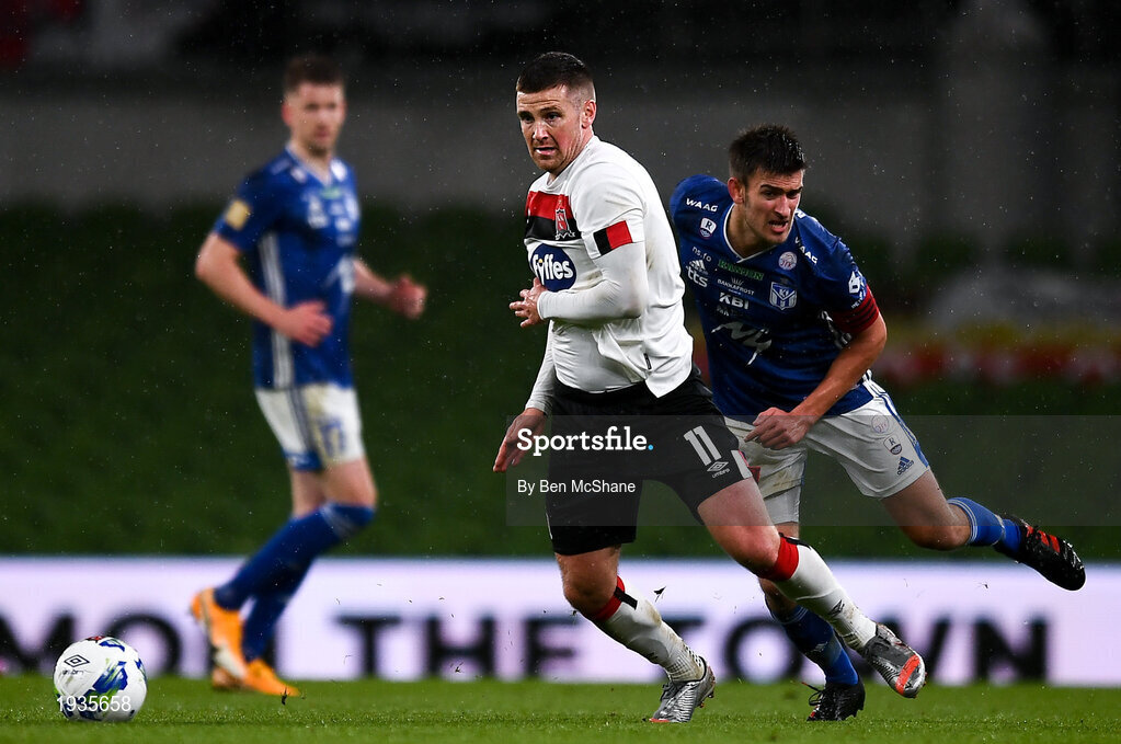 1 October 2020; Patrick McEleney of Dundalk in action against Jákup Andreasen of Ki Klaksvik during the UEFA Europa League Play-off match between Dundalk and Ki Klaksvik at the Aviva Stadium in Dublin. Photo by Ben McShane/Sportsfile