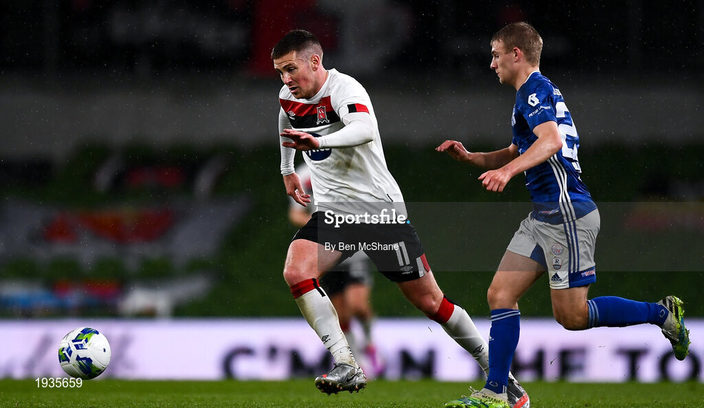 1 October 2020; Patrick McEleney of Dundalk in action against Jóannes Danielsen of Ki Klaksvik during the UEFA Europa League Play-off match between Dundalk and Ki Klaksvik at the Aviva Stadium in Dublin. Photo by Ben McShane/Sportsfile