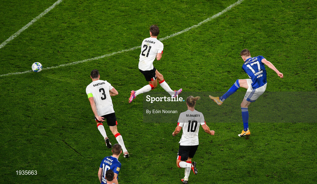 1 October 2020; Ole Erik Midtskogen of Ki Klaksvik scores his side's first goal during the UEFA Europa League Play-off match between Dundalk and Ki Klaksvik at the Aviva Stadium in Dublin. Photo by Eóin Noonan/Sportsfile