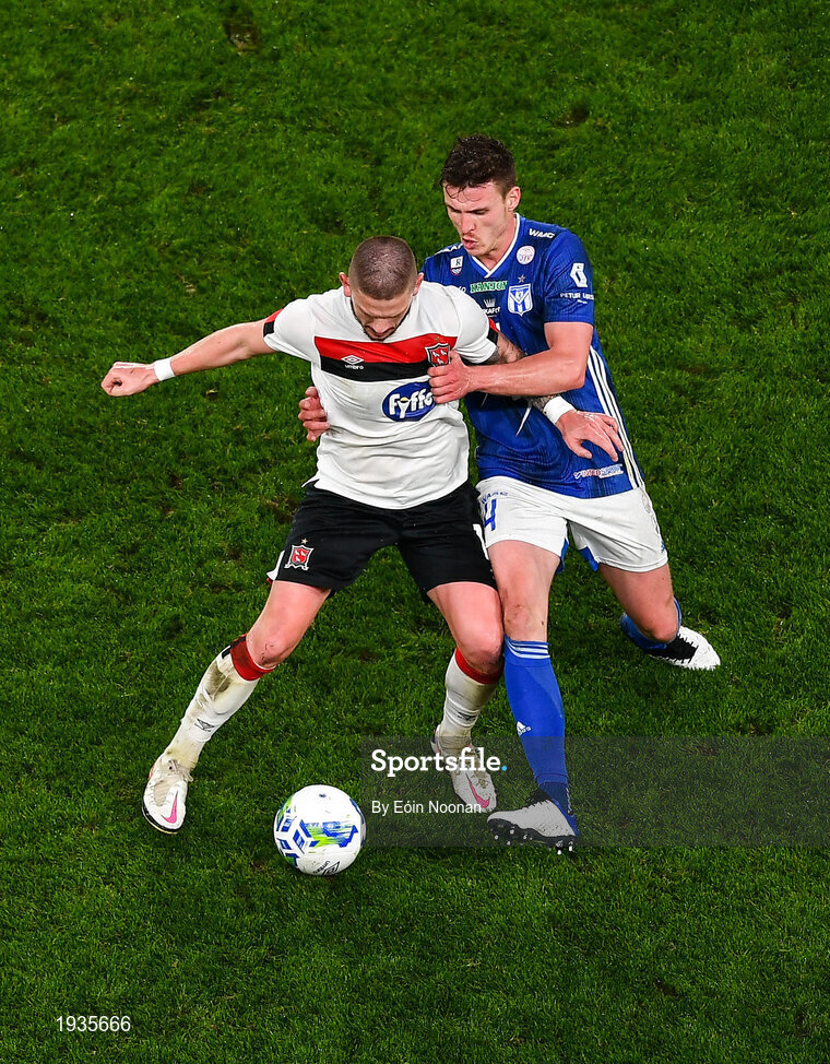 1 October 2020; Sean Murray of Dundalk in action against Deni Pavlovic of Ki Klaksvik during the UEFA Europa League Play-off match between Dundalk and Ki Klaksvik at the Aviva Stadium in Dublin. Photo by Eóin Noonan/Sportsfile