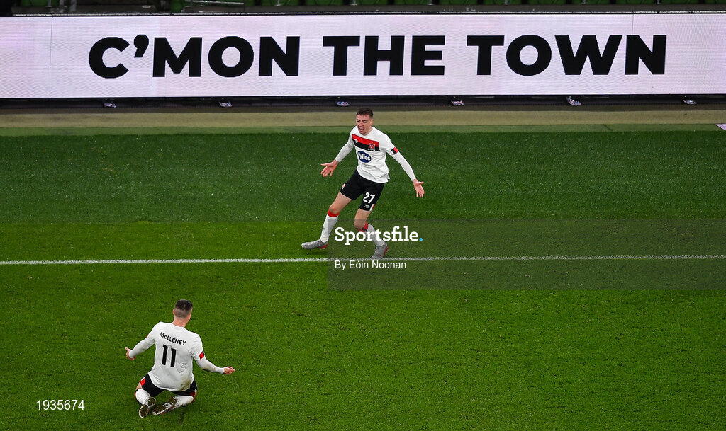 1 October 2020; Daniel Kelly of Dundalk celebrates with team-mate Patrick McEleney, 11, after scoring his side's third goal during the UEFA Europa League Play-off match between Dundalk and Ki Klaksvik at the Aviva Stadium in Dublin. Photo by Eóin Noonan/Sportsfile