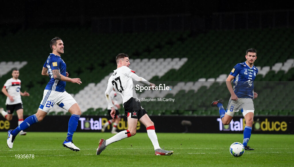 1 October 2020; Daniel Kelly of Dundalk shoots to score his side's third goal during the UEFA Europa League Play-off match between Dundalk and Ki Klaksvik at the Aviva Stadium in Dublin. Photo by Stephen McCarthy/Sportsfile