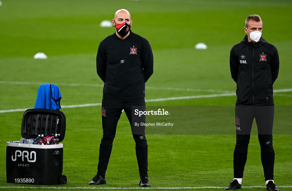 1 October 2020; Dundalk strength & conditioning coach Graham Norton and Dundalk physiotherapist Danny Miller, right, during the UEFA Europa League Play-off match between Dundalk and Ki Klaksvik at the Aviva Stadium in Dublin. Photo by Stephen McCarthy/Sportsfile