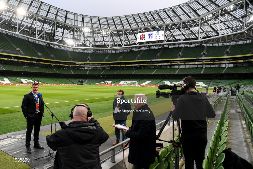 1 October 2020; Ki Klaksvik manager Mikkjal Thomassen waits to be interviewed prior to the UEFA Europa League Play-off match between Dundalk and Ki Klaksvik at the Aviva Stadium in Dublin. Photo by Stephen McCarthy/Sportsfile